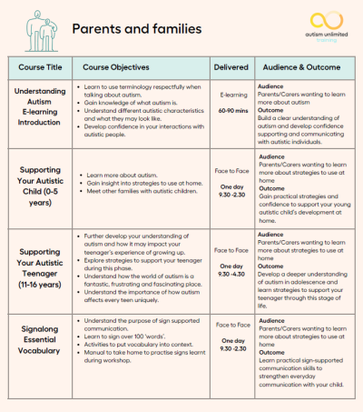 - Early Years Autism Workshop: Designed for parents/carers of children aged 0-5 years just starting out on the autism diagnosis journey, learn and appreciate the uniqueness of autism and strategies to use at home.